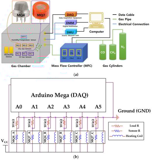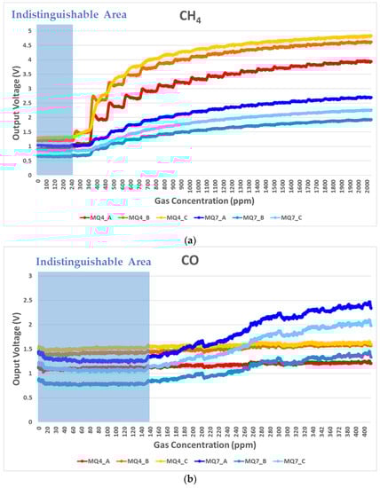 Moreover, the operating temperature also affects the sensors’ performance [,,]. Practically, the best temperatures for CH4 and CO to be adsorbed on the SnO2 surface are very different, presenting less cross-selectivity with respect to other gases. However, even if sensors operate at the best operating temperature for each gas, the cross-selectivity issue still cannot be fully ignored. This study employed the selectivity differences among the two types of sensor for decoupling. Thus, the operating temperature of each sensor should be constant by fixing an operating voltage of 5 V (Vcc) and the heating coil resistance of each gas sensor. Figure 1b shows that the sensor circuit comprised three cross-arranged MQ4 and MQ7 sensors for effective gas detection.
