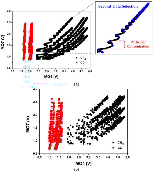 Pairing plots for the CH4 and CO gas detection data sets: (a) all possible pairing cases with first data selection for one experiment data (inset: second data selection detail) and (b) second data selection for all experiment data sets.