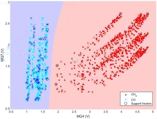 We designed the SVM for classifying CH4 and CO gases using MATLAB®. In general, SVM is a machine learning method classifying two or more data classes [,,,,]. This study built a classification model with non-linear SVM to classify curved behavioral patterns. In the SVM algorithm, kernel function helps modeling for non-linear hyperplane with reduced computational costs. Thus, we employed a Gaussian RBF kernel function, which is one of the generally used and high-performance functions, which can be expressed as;