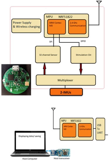 A custom designed IMU network to record leg movements: the sensor system diagram and the manufactured wireless IMU sensor circuit.