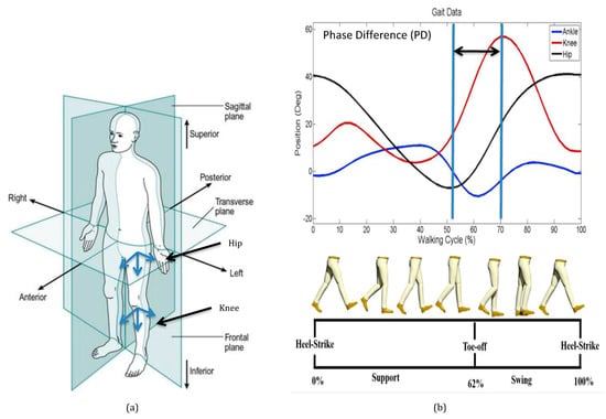 One gait cycle of human walking: (a) description of the hip and knee local coordinate system that are referenced to the anatomical position in three reference planes; (b) description of the phase difference motion of the hip and knee in the sagittal plane [17].