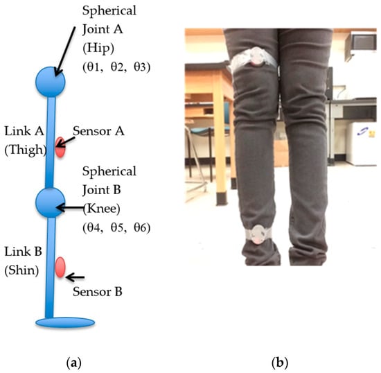 Three-dimensional joint angles: (a) description of a human leg model as a kinematic manipulator that consists of two physical links (i.e., thigh and shin) and joints (i.e., hip and knee), each having three rotational joints, the transformation; (b) an experimental sensor network setup.