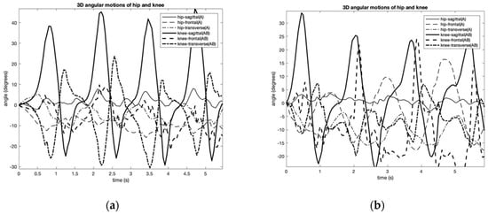 This experiment provides the results of three-dimensional gait analysis performed on a single participant (i.e., an author). The experiments were performed multiple times to ensure the repeatability of the results and to obtain a statistically significant data set. A PC was then used to record and process the data. The experiments were completed the same way each time but on different days. There was only a single individual that performed the test, and thus, the sampling size was not statistically significant. However, for proof of concept purposes, the test was successful and serves as motivation to repeat the tests on a larger sample size in the future. Figure 5 shows the two kinds of gait patterns that were considered: hemiplegic and normal gaits. Three-dimensional kinematics of the hip and knee joint angles were recorded and calculated. The figure shows the relative angles of the hip and knee during the gait cycle along with extension and flexion in the sagittal plane, the frontal plane, and the transverse plane. From the figure, it can be noticed the changed coordination phase of the hip and knee movements of the Hemiplegic gait.