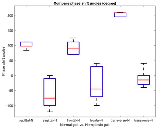 This study uses the instantaneous signal (i.e., the temporal derivative of the oscillation) since it is useful for describing the non-monochromatic nature of the joint angle signals. Further, it also helps to reduce the effect on noises in IMU signal measurement, such as the signal shift and offset errors. Figure 6 shows the normalized gait phase diagrams of the hip and knee joint angles of Figure 5. From the diagram, the phase deference angles (i.e., hip-sagittal vs. knee-sagittal; hip-sagittal vs. knee-frontal; hip-sagittal vs. knee-transverse) are calculated using Equation (25). All phase deference angles of the two gait patterns are summarized in Figure 7. The figure indicates that all the sagittal, frontal, and transverse directions show a different pattern between the normal and the hemiplegic gait of the subject. Table 1 summarizes the experimental results from multiple trials of the subject.