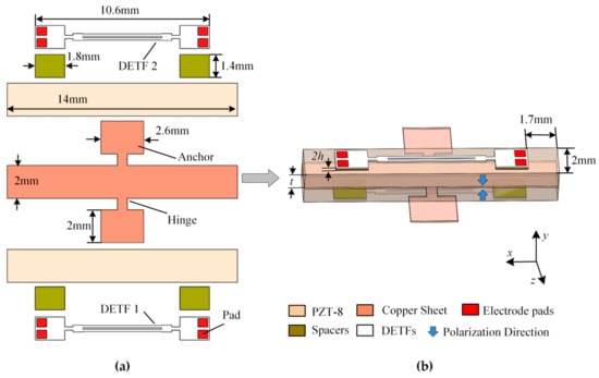 The schematic diagram of the differential voltage sensor is shown in Figure 1, including a piezo bimorph, dual DETFs and four quartz crystal spacers. The series connection mode [] was used in the piezo bimorph fabrication, namely, two piezoelectric Pb(Zr1−xTix)O3 (PZT-8) plates with an opposite polarization direction bonded on both sides of a copper sheet by epoxy resin and an electrical voltage, which was applied across the total thickness. Two support hinges with a rectangular anchored structure was designed in the middle of the copper sheet. The two anchors were used to fix the sensor. The sizes of PZT-8 plates were . The main body of the copper sheet was the size of . The sizes of the hinges and rectangular anchors were  and , respectively. The dual DETFs were symmetrically bonded on the upper and bottom surfaces of the piezo bimorph, respectively. In order to transfer the action force of the piezo bimorph and keep non-contact of the tines of the DETFs with the piezo bimorph, four spacers were bonded under the double ends of each DETF. The spacers were cut from a Z-cut quartz sheet with a size of .
