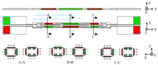 The structure of the device can be analyzed using the Euler–Bernoulli model []. Due to the symmetry, the neutral layer and neutral axis were at the mid-thickness and the geometric center of the structure, respectively. As the neutral axis acts as a level-arm and determines the stress distribution within the structure