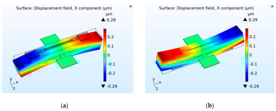 Displacement distribution of the sensor structure under the action of applied voltage of (a) +700 V and (b) −700 V.