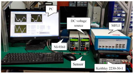 The overall view of the experimental setup is shown in Figure 6. A precision impedance analyzer (a lock-in amplifier with impedance analyzer option, MFLI 5 MHz, Zurich Instruments, Zurich, Switzerland) was used to test the impedance characteristics of the resonant voltage sensor. A DC voltage source (1000 V, 0.2 A, Hanshengpuyuan, Beijing, China) was used to measure the response characteristics of the sensor over a high voltage range, and a precision DC power supply (Keithley 2230-30-1, Tektronix, Beaverton, OR, USA) was used to evaluate the resolution of the sensor. The frequency of the output signal from the gate oscillator was measured by a NI-9361 digital counter with LabVIEW software. An automatic system was built for the measurement of the voltage response characteristics and the resolution of the sensor by LabVIEW software. The entire experiment was carried out at room temperature and ambient air pressure.