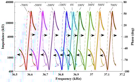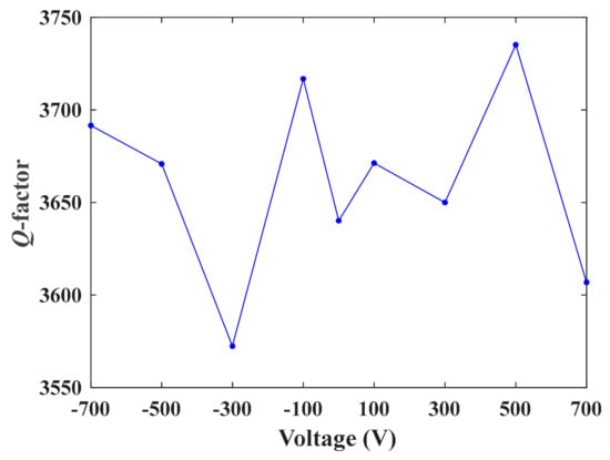 Figure 7 shows the impedance characteristics of the DETF 2. Obviously, the resonant frequencies clearly changed with the DC voltage. The Q-factor of the DETF was determined by , where,  was the resonant frequency of the DETF,  and  were the frequencies at the half power points. The values of , , and  were obtained from the impedance characteristics curves by the method described in []. Figure 8 shows the Q-factor of DETF 2 as a function of DC voltage. The Q-factor fluctuated between 3572 and 3735, with an average value of 3661. The fluctuation of the Q-factor may have resulted from the limited number of sweep data points of the impedance curves, which were measured by the sweep frequency method []. The high Q-factor meant that the sensor may have obtained high signal-to-noise ratio, high resolution and low power consumption.