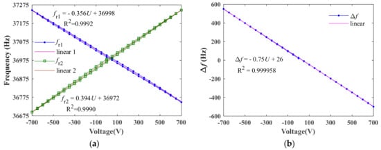 Figure 9a shows the resonant frequencies of DETF 1 and DETF 2 as a function of the applied DC voltage. In the range of ±700 V, the total frequency shift of DETF 1 and DETF 2 was 498 Hz and 551 Hz, respectively. The linear fitting functions were obtained as  (linear correlation coefficient R2 = 0.9992) and  (linear correlation coefficient R2 = 0.9990). Thus, the voltage sensitivities measured by DETF 1 and DETF 2 were 0.356 Hz/V and 0.394 Hz/V, respectively. Figure 9b shows the differential frequency output of the sensor as a function of the applied DC voltage. In the differential configuration, the total frequency shift was almost doubled, being 1049 Hz. This result agreed well with the simulation result. The small difference between the experimental and simulation results may have resulted from the dimensions and parameters errors of the DETFs and the PZT-8 plates as well as the neglect of the adhesive layer in the simulation. From Figure 9b, the linear fitting function became  (linear correlation coefficient R2 = 0.999958) showing the sensitivity of the sensor as 0.75 Hz/V. In addition, the differential output of the sensor had a non-linearity error of 3 Hz (0.29% of the full range).