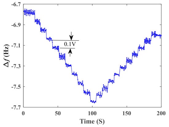 Figure 9 and Figure 10 also show the behavior of the hysteresis loop when the DC voltage increased and then decreased. From Figure 9, the maximum hysteresis of the differential frequency output was about 8 Hz (0.07% of the full range). For a voltage sensor employing piezoelectric material, the hysteresis effect is inevitable due to the time delay in domain switching []. It is very important to reduce the hysteresis for sensing applications employing piezoelectric materials. Usually, the lag compensation methods which have been employed in many piezoelectric actuators can be taken to reduce the hysteresis []. This work may be carried out in future.