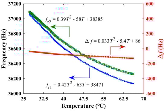 An initial evaluation of the temperature characteristics of the differential resonant voltage sensor was carried out. Figure 11 shows the resonant frequencies of individual DETF and the differential frequency output as a function of temperature over room temperature of 27 °C to 67 °C. As can be seen, the resonant frequency shifts measured by the DETF 1 and DETF 2 were 925 Hz and 832 Hz over the temperature range from a room temperature of 27 °C to 67 °C, while the shift in the differential frequency output reduced to 93 Hz. Furthermore, by using the polynomial fitting method, one obtains the fitting function of the curves of ,  and  as follows: