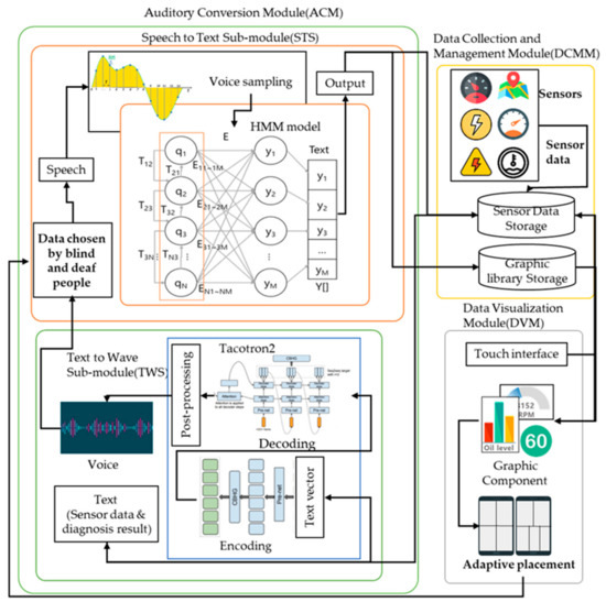 The data collection and management module (DCMM) stores and manages all the sensor data collected from the vehicle, self-diagnosis data, and graphics libraries in in-vehicle storage. The auditory conversion module (ACM) receives speech and provides voice output about the vehicle’s condition. The ACM consists of a speech-to-text submodule (STS) that recognizes speech and converts it to text data and a text-to-wave submodule (TWS) that converts data to voice. The STS learns HMM point-to-point using the in-vehicle NVIDIA px2 driver and receives a sensor name from the user by using the learned HMM. The TWS converts text data to voice using Tacotron2 and outputs it. The data visualization module (DVM) visualizes the data received from the DCMM and places the visualized data, the graphic components, on an in-vehicle display.