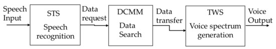 The auditory conversion module (ACM) receives the user’s speech and provides voice output of the vehicle’s condition. Figure 3 shows the flow of the ACM. The ACM consists of a speech-to-text submodule (STS) that recognizes speech and converts it into text data and a text-to-wave submodule (TWS) that converts text data to voice. The ACM receives the data that has to be audified by using the STS. The ACM transmits the received data to the DCMM, and the DCMM again transmits the data that has to be audified to the ACM. The ACM then generates sentences with the data, which have to be audified using the TWS and delivers them after changing to voice. For example, if a person says, “Tell me the brake status when the sound is strange,” the STS recognizes it and requests the information about the brake sensors and the vehicle’s self-diagnosis information to the DCMM. The DCMM transmits the brake information and the vehicle’s self-diagnosis information to the TWS, and the TWS informs the user after turning them into voice.
