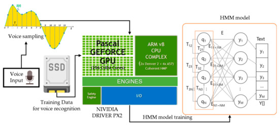 The STS uses the HMM to recognize speech. Unlike a recurrent neural networks (RNN), which reflects all previous states, the HMM recognizes the user’s voice based on the Markov chain, which relies on the immediately previous state. Because the STS recognizes in a short word the data that have to be visualized in a short word, the HMM is more efficient than the RNN. The STS learns the HMM independent of the cloud and receives speech from the vehicle’s microphone and outputs the text data by using a point-to-point learning method and NVIDIA PX2 driver. An in-vehicle solid-state drive (SSD) transmits training data to the NVIDIA PX2. The NVIDIA PX2 learns the HMM using it. The learned HMM converts speech to text data. The ACM transmits the converted text data to the DCMM. Figure 4 shows the learning order of the HMM.