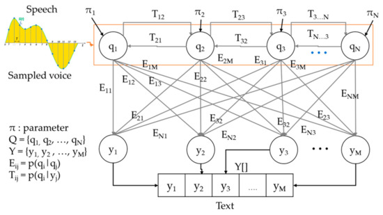 When the list of states is computed, the STS learns the HMM’s θ by using the Baum–Welch algorithm and the training data. In other words, the STS computes the probability of observed values and the list of states by specifying the initial θ and learns the HMM based on them. Because the STS outputs part names by receiving the user’s speech and the observed STS value, Y becomes the part name of a vehicle that can be audified, and these are shown in Table 2.