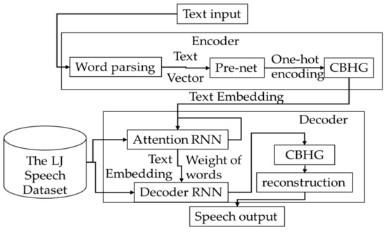 The text-to-wave submodule (TWS) audifies the sensor data transmitted from the DCMM. It executes text-to-speech (TTS) using Google’s Tacotron2 [23]. Because the Tacotron2 operates on the basis of an RNN encoder–decoder model, in this paper Tacotron2 is learned by using the LJ Speech Dataset [24] and estimates whether the sensor data of the vehicle are accurately output to voice. Figure 6 shows the flow of the TTS.