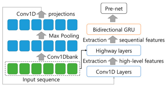 When the pre-net one-hot encodes the text vector, the TWS transmits it to the Tacotron2’s convolution bank + highway net + bidirectional gated recurrent unit (CBHG) network, a neural network model. The convolution bank extracts the features of text from one-hot-encoded text vectors, the highway net deepens the neural network model, and the bidirectional gated recurrent unit (GRU) generates text embedding by considering the previous and subsequent information of vectors processed in pre-net. The input sequence of the Convolution Bank is K sets of 1-D convolutional filters. Where 1 set of 1-D convolutional filters consists of C1, C2, C3 … and CK filter. The input sequence is max-pooled. The output of the Convolution Bank is delivered to the Highway Net which extracts high-level features from it. Finally, the Bidirectional GRU extracts sequential features using the order of the input sequence. Figure 7 shows the structure of the CBHG.