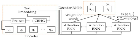 Here, aij means the weight of the input states. An input state with high weight has a greater influence on the output state. The aij is normalized to 1. The in Equation (14) means the number of words entered in the decoder, and aij indicates how similar the ith vector of text embedding and the jth vector of the encoder are in the previous step. The e is computed in Equation (15). In Equation (15), α represents a constant to optimize the similarity between s(i–1) and qj like the learning rate of a neural network model, s(i–1) represents the text embedding vector of the previous step when the decoder predicts the ith word, and qj represents the jth column vector of the encoder.