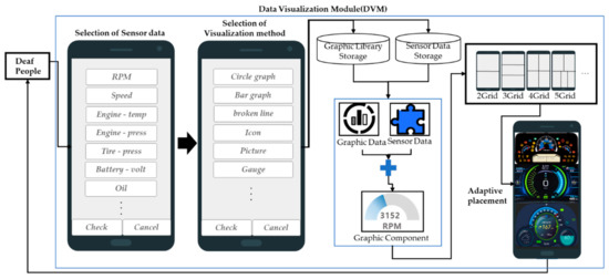 The data visualization module (DVM) receives all the sensor data collected from the vehicle and visualizes only the data that deaf people desire by using an adaptive component placement algorithm that adjusts and places the graphical user interface (GUI) components properly on the vehicle’s display. Figure 9 shows the structure of the DVM.