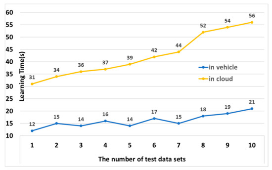 Figure 10 shows the time it took for the STS to learn the HMM in the cloud and in a vehicle. In this experiment, the time to learn the HMM was measured with 1 to 10 test datasets. In the vehicle, the number of test datasets did not have a significant impact on the learning time, but the learning time in the cloud was increased as the number of test sets increased. The trend line of learning time from the vehicle is 0.78182 and that of from the cloud is 2.84242. In the vehicle, the more learning data the HMM have, the more effective the HMM learning is. In addition, since the average learning time in a vehicle is about 2.5 times faster than in the cloud, this paper proposes using the HMM in the vehicle rather than in the cloud.