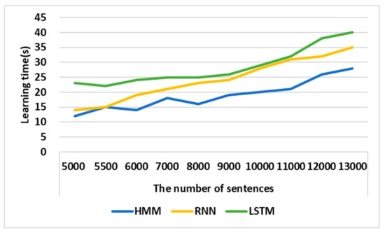 Figure 11 shows the learning times of HMM, RNN, and LSTM. The learning time for each model was measured, increasing the sentences in the test dataset from 500 to 13,000. The sentences used in the experiment are included in the LJ training data sets. The experimental results show that the HMM was able to recognize speech faster than RNN and LSTM by 25% and by 42.86%, respectively. When the number of the test sentences was small, there was little difference in the learning time between the RNN and the HMM, but as the number of the test sentences grew larger, the time of the HMM learning become faster. Therefore, the HMM is the most appropriate to ensure the real-time of AVS speech recognition and voice transmission.