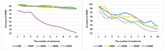 Figure 12 shows the accuracy of HMM when the sentences with noise were entered into the HMM. The sentences used in the experiment were included in the LJ training data sets and were not used in the HMM’s training. The accuracy is computed by comparing the difference between when a sentence is entered into the HMM and when it is output. The experiment was conducted using 1 to 10 sentences, and the sentences with the noise of 0 dB, 40 dB, 60 dB, 80 dB, and 120 dB were entered into the HMM.