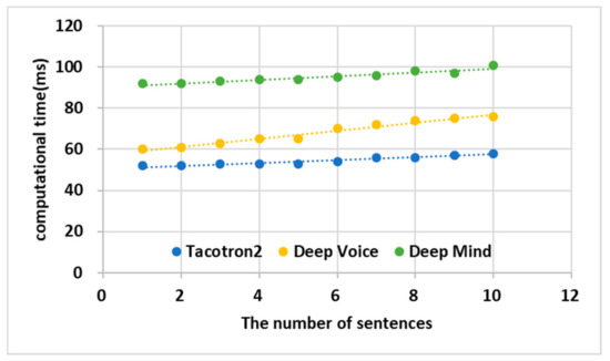 Figure 13 shows the computational time it took for the TTS engines Tacotron2, Deep Voice, and Deep Mind to convert text into voice when sentences were increased from 1 to 10. The sentences used in this experiment are those not used for learning among LJ Training data sets. Tacotron2 converted text into voice about 20 ms faster than Deep Voice and about 50 ms faster than Deep Mind. The TWS converted the vehicle’s data into voice using Tacotron2, so real time could be guaranteed. The computational time of the Deep Mind is about 1.5 times slower than the Deep Voice and Tacotron2. As test data sets get more, the difference of computational time between the Tacotron2 and Deep Voice gets bigger. The trend line of the Tacotron2 is 0.69091 and that of the Deep Voice line is 1.95758. Therefore, the AVS should use Tacotron2 to ensure real-time voice transmission.