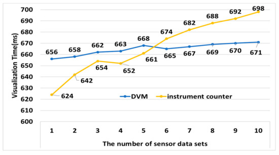 Figure 14 compares the time it took for the sensor data to be displayed on the vehicle’s instrument counter to analyze the performance of the DVM. Performance analysis used 1 to 10 datasets for visualization. The average time for the DVM to visualize sensor data was about 665 ms and for the instrument counter was about 667 ms. The DVM was about 2 ms faster than an existing instrument counter; it can visualize information without compromising the real time of an existing instrument counter. However, the instrument counter cannot display information more accurately than the DVM because it should display only the information that is visible in driving, and as test data sets gets more, it takes more time for the counter to visualize sensor data than DVM. When the number of sensor data sets to be visualized was 10, the DVM was about 20 ms faster than the instrument counter in visualizing sensor data.