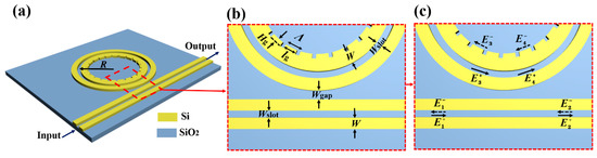 The three-dimensional (3D) schematic of the proposed sensing device is shown Figure 1a. The SOI wafer was adopted as the waveguide material, with 220 nm Si on a 2 μm SiO2 substrate. Homogeneous sensing is implemented in this paper, so the sensor device is immersed in aqueous solutions. Naturally, pure water was chosen as the top cladding in the process of determining the geometric parameters of waveguides. This homogeneous sensing case can be easily extended to surface sensing applications by covering thin adsorbed analyte for the top cladding in the calculation. The bent radius (R) of the SMRR is designated as the distance between the center of the rings and the middle of the slot, and set to 5.86 μm. The gap width between the bus and the ring waveguide is denoted as Wgap. Other geometric parameters are depicted in Figure 1a,b. The ring and bus waveguide have the same slot width (Wslot). The strip waveguide width W and the slot width Wslot are set to 210 nm and 100 nm, respectively, which enables an extremely strong restriction of the electric field with the mode confinement factor of over 30% [20]. The etched IG has the azimuthal period (Λ) of about 1171 nm, azimuthal width (lg), and the duty cycle (F) (ratio of silicon block to the period). The structure of the gratings is achieved by etching a quasi-rectangular region (lg × Hg) from the inner-wall of the ring waveguide. Here, Hg is corrugation depth of the grating. Propagation of the optical fields is shown in Figure 1c. Here, , , , represent incident optical field amplitudes, and , , , represent reflected optical field amplitudes in the corresponding positions.