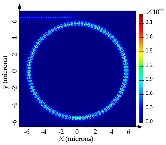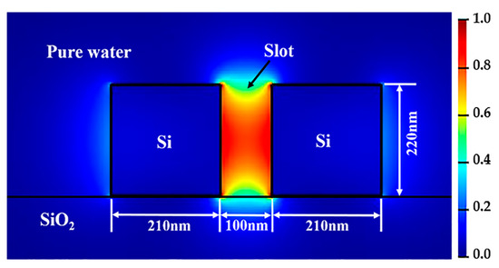 MODE Solutions software of Lumerical Inc. (Vancouver, BC, Canada) [22] was utilized to construct the device model and calculate the spectral responses of the sensor. A tunable laser of TE-like (the fundamental mode, TE0) was injected into the bus waveguide. The mode field distribution was calculated by using Finite Difference Eigenmode (FDE) solver, as shown in Figure 3. The varFDTD solver based on variational FDTD propagation method collapses a 3D geometry into a two-dimensional (2D) set of effective indices that can be solved with 2D FDTD (usually regarded as 2.5D), which ensures the high calculation accuracy and saves much memory and simulation time. The spectral responses of the proposed sensor were carried out by the varFDTD solver. In the process of the following parameter optimization, pure water is acted as the top cladding.