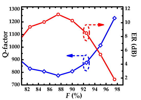 The dependence of Q-factor and ER on the duty cycle F are shown in Figure 4. Variation trend of Q-factor and ER is in the opposite direction. Considering the trade-off between Q-factor and ER, F is set to 95%, and the corresponding Q-factor and ER are 1014 and 5.4 dB, respectively. Definitely, ER can be enhanced by balancing the corrugation depth Hg and adjusting the coupling distance Wgap. When F increases to 97.5%, ER less than 2 is difficult to be optimized to a favorite value in the subsequent parameter optimization.