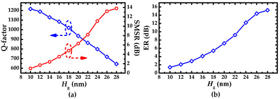 Q-factor, SMSR, and ER as a function of etched depth Hg of the IG are shown in Figure 5a,b. Q-factor decreases linearly with the increase of Hg, which is due to the increasing of scattering loss caused by IG. But bigger Hg is beneficial to SMSR and ER. Therefore, considering the trade-off of Q-factor and SMSR, Hg was chosen as 18 nm. The corresponding Q-factor, ER, and SMSR are 1020, 5.4 dB, and 4.8 dB, respectively. Admittedly, the small size of Hg brings a high degree of difficulty for the device fabrication. W. Shi et al. fabricated the sidewall grating with the corrugation depth of 15 nm based on SOI platform and achieved the wide operating range for MRR.