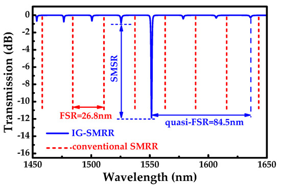 The operating principle of the designed sensor is demonstrated in Figure 2, in which the spectral responses of SMRR, IG, and IG-SMRR are described. The optical transmission can be regarded as two filtering processes. The light in the bus waveguide is filtered by SMRR at first, and the resonant light is filtered by IG again. SMRR and IG have the same resonant wavelength (near @1550 nm) as the main resonant peak of IG-SMRR, and other resonant lights of SMRR are filtered by IG. The IG-SMRR with the wavelength-selective characteristic is not restricted by the FSR of SMRR. In the second filtering course, some side-modes should be effectively suppressed by optimizing the corrugation depth of IG. Side-mode suppression ratio (SMSR) is utilized to evaluate the suppressed quality.