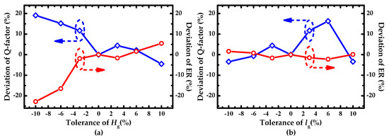 Effect of deviations of (a) Hg (corrugation depth) and (b) lg (azimuthal width) on Q-factor and ER.