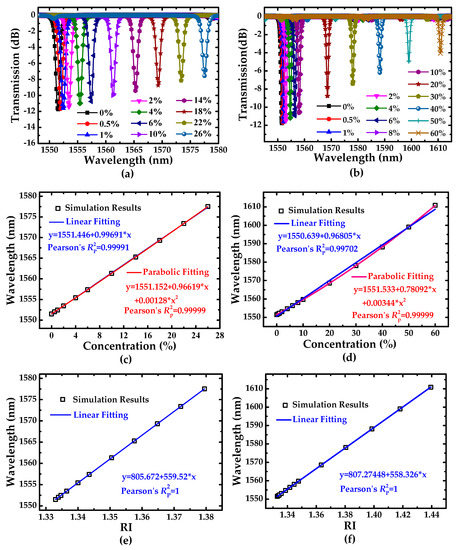 As concluded in Table 2, the concentration sensitivities of the sensor for sodium chloride solutions and D-glucose solutions are 996.91 pm/% and 968.05 pm/%, respectively. Compared with [19], both solution concentrations are over 10 times that of 95.27 pm/% and 95.33 pm/%, respectively. The for linear fit is less than the for parabolic fit, which illustrates that the 2 order parabolic fitting can depict the function relationship between the resonance wavelength and solution concentration more precisely than linear fitting [19,28,29,30,31]. For the low concentration variations of sodium chloride solutions, for linear fit is 0.99991, which shows the relationship between the resonance wavelength and solution concentration is nearly linear. However, for high concentration range of D-glucose solution, parabolic fitting can be considered. For the concentration sensitivity, a conclusion can be drawn that the linear fitting and parabolic fitting are suitable for the smaller range and larger range concentration detections, respectively.