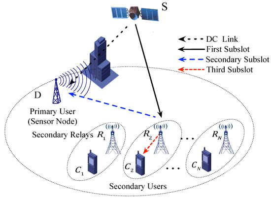 An overlay diagram of the HSTSNs with multiple potential secondary relays is considered as illustrated in Figure 1. This scenario comprises a primary satellite transmitter S, a sensor node D, i.e., the PU, potential CR secondary relays sets and the secondary users (SUs) sets , respectively. Due to the heavy shadowing and obstacles, it is difficult to maintain a reliable direct communication (DC) link between S and D. Therefore, the primary satellite has to recruit a secondary transmitter as a relay. In return, the primary networks authorize secondary transmitter spectrum access opportunities. All this potential secondary relay would have the willingness to be recruited by the primary satellite network. The chosen secondary relay does its best to transmit the data as much as possible. Without loss of generality, we assume one PU and one SU to simplify the analysis, which can be easy to extend to multi-users scenarios by using other subchannels.
