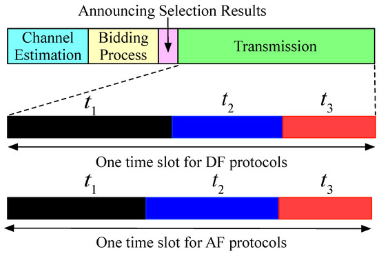 Time frame structure for auction-based selection and time slot design for DF and AF relay protocols.