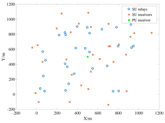 We assume the secondary relays follow the uniform distribution around the primary user in square range with the side length of 1000 m. The secondary receiver obeys uniform distribution around its transmitter in a circle with a radius of 300 m. We generate 30 relays and the users, respectively, for example in Figure 3.
