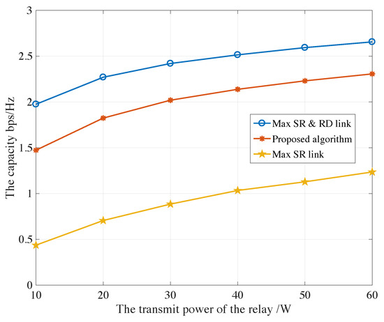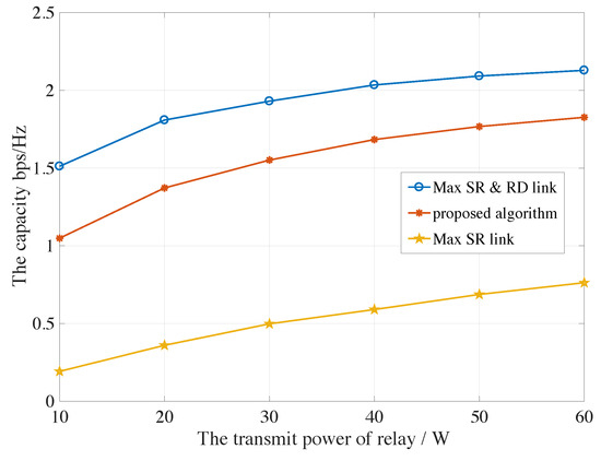 The capacity of PU under the maximum satellite-relay and relay-destination scheme, the proposed algorithm and maximum satellite-relay scheme verse different transmit power of relays for AF protocols.