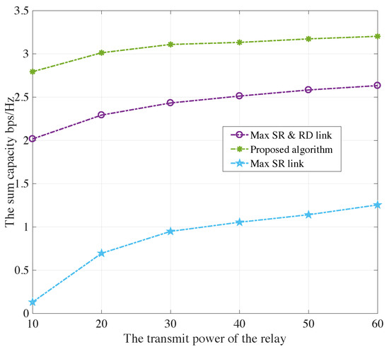 The sum capacity of both PU and SU under the maximum satellite-relay and relay-destination scheme, the proposed algorithm and maximum satellite-relay scheme verse different transmit power of relays for AF protocols.