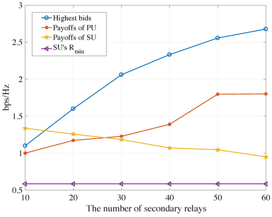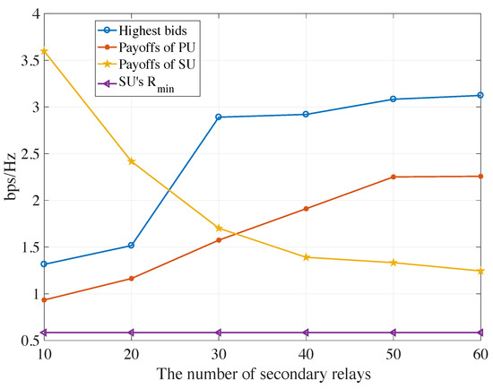 Figure 8 reveals the highest bids, payoffs of the PU and SU in AF protocols, valued by the channel capacity, where the secondary relays’ transmitted power and AWGN power is 10 W and −40 dBw, respectively. It is observed that the payoffs of the PU increase as the number of secondary relays increases. However, payoffs of the chosen SU continue to decrease as the number of potential competitors increases, which is the same as the market place. If the primary would like to obtain as many payoffs as possible, It must recruit as many secondary relays as possible for the competition. In some extent, the highest bid is the up-boundary of the capacity of the PU and the minimum requirement of the SU is the low-boundary of the capacity of the SU. Figure 9 illustrates the highest bids, payoffs of the primary and secondary users in DF protocols, where the same trends can be seen as shown in the AF mode.
