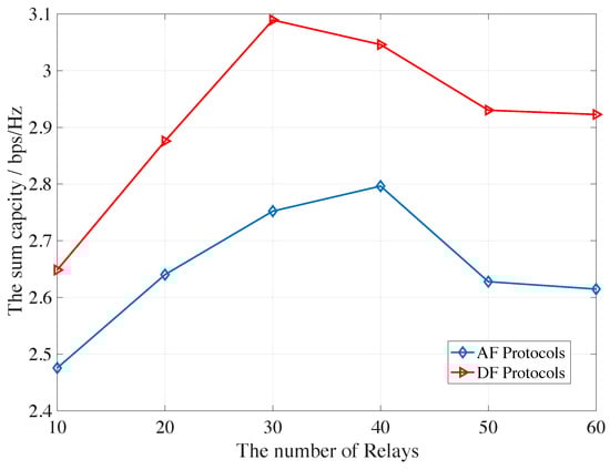 Finally, Figure 10 illustrates the total transmitted capacity for both the primary network and the secondary network versus the different number of the potential relays. It is obvious that payoffs of the AF protocol are lower than that of the DF protocol, which is due to the fact that the noise is amplified from the first temporal phase for the AF relay protocol. However, the DF relay protocol is more complicated.