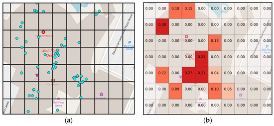 To illustrate this process, the region of interest is usually discretized into a grid. To see the effect of a hypothesis, consider one that states that “people are in stores with 40% of belief”; then we can query the geographical data to check where the stores are located, e.g., stores could be situated in the blue dots on the Figure 1a. After this, the belief is computed using the combination rule for each grid; the result of this computation is shown on Figure 1b.