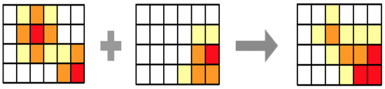 In the example above, only one hypothesis was tested and computed. As we explained before, many hypotheses can be combined in order to obtain the final suitability map. The integration is performed by comparing the predicted values of each cell in the grid with the corresponding ones in the result of the other hypotheses; the combination considers the values both hypotheses predicted and the weight they have according to the statement of the hypothesis. Figure 2 illustrates the process of combining two belief maps obtained from the evaluation of a hypothesis. When comparing two cells, there are two options, both sources agree in their result and then the combination keeps their value, or the sources differ in results and then they have conflict, which implies uncertainty increases, and the value of the variable decreases.