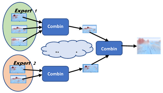 Hierarchical combination process. The figure shows that expert 1 generated three and expert 2 two scenarios individually. Expert 1 produced a single scenario combining the maps generated by her and presenting it to expert 2 for consideration. Expert 2 did the same with her two maps. After a discussion process (which is supported by the developed system) both experts agree to combine their scenarios in a single one, which is used for developing emergency preparedness plans.