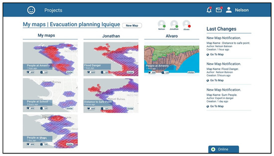 Screenshot showing the user Nelson exploring the maps that have been generated inside the “Evacuation planning Iquique” project.