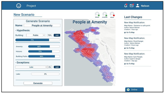 Let us assume the user Nelson has an expertise in analyzing urban areas where there can be agglomeration of people during a natural disaster. He has several hypotheses about why people concentrate in certain places and he wants to generate a map showing the number of people in the places near the coastal regions. Using the platform, he can include those hypotheses, giving them a percentage of mass and specifying exceptions that might occur (Figure 6). The platform takes this information and generates a belief map about which are the places where a large number of people could gather.