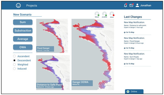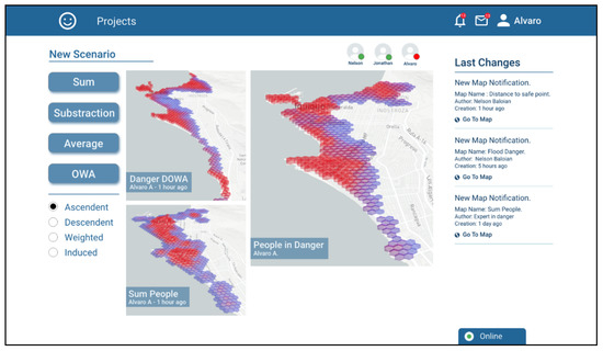 The first view corresponds to the view a user has when logging into the platform. It shows the ongoing projects in evaluation/discussion, and the scenarios that participants recently generated which the user has not seen yet (Figure 4). It also shows the participants of the project, in this case three: Nelson, Jonathan and Alvaro. According to the screenshot, Nelson is the one who is logged in, Jonathan is also online but Alvaro is not. The screenshot shows there are three ongoing projects “Landslide prevention Chaiten”, “Evacuation planning Iquique”, and “Fire prevention Valparaiso”.