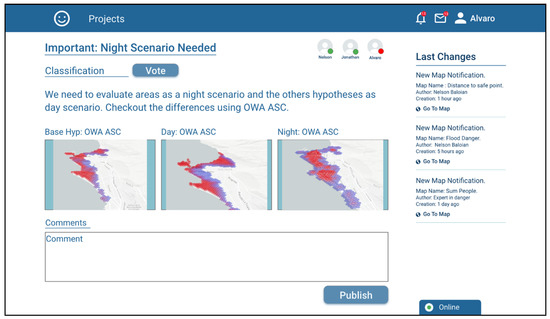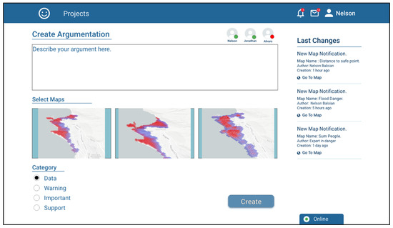 The application also implements a tool that can be used for supporting the asynchronous discussion and the pertinence, validity or convenience of using a given scenario for preparing the actions needed to react in case of a disaster and/or plan the rescue and mitigation procedures. This tool consists of creating “Argumentation Objects”, e.g., to discuss the need to carry out a differentiated evaluation for night periods. In order to give context to the argument, it is possible to attach previously created scenarios and assign them a discussion category. Figure 10 shows a screenshot when user Nelson is creating an Argumentation Object.